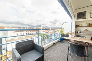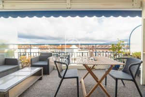 Une terrasse ensoleillée exposée SUD, offrant une vue dégagée sur les toits de la ville et les montagnes des Pyrénées, idéale pour vos moments de détente face au paysage des montagnes Basques.