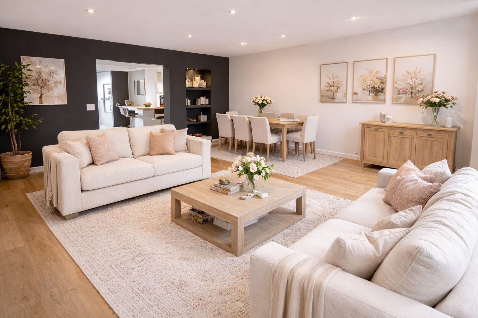 Un salon lumineux, baigné de lumière naturelle, offrant une ambiance chaleureuse et conviviale.