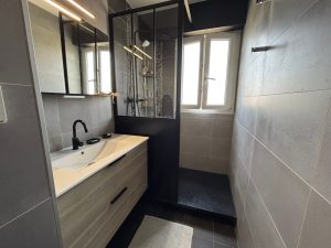 Salle de bains contemporaine avec douche à l’italienne, cave privative et stationnement libre dans la résidence.