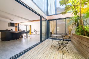 La vaste pièce de vie, baignée de lumière, s’articule autour d’un patio central qui confère à l’ensemble charme et luminosité. Une terrasse exposée plein sud prolonge harmonieusement cet espace convivial, idéal pour recevoir ou se détendre.