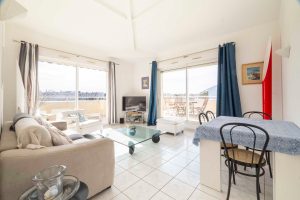 Le séjour, baigné de lumière grâce aux larges baies vitrées, s’ouvre directement sur la terrasse. L’appartement se compose également d’une cuisine indépendante (avec possibilité d’ouvrir sur le séjour), de deux chambres, d’une salle de bains et de rangements. L’ensemble est fonctionnel, agréable à vivre et profite d’une vue dégagée et d’un environnement calme, avec une perspective sur les montagnes en arrière plan.