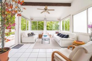 Dès l’entrée, vous découvrez une pièce de vie composée d’une salle à manger et d’une véranda chauffée et climatisée bénéficiant d’une triple exposition, véritable espace de vie lumineux au quotidien, une cuisine, une salle de bains et un WC séparé. Une seconde véranda côté Ouest peut également faire office d’entrée principale et offre un accès direct avec possibilité de plusieurs stationnements.